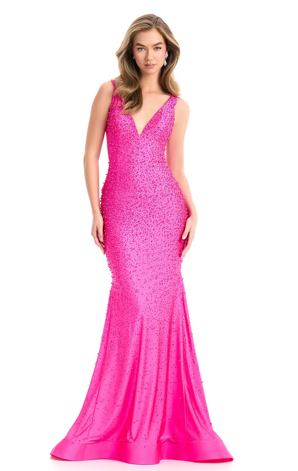 Step into the spotlight in the ASHLEYlauren 12030 Gown, a stunning pearl- and stone-encrusted showstopper available at Lady Black Tie. Crafted from luxurious jersey, this gown offers a smooth, sculpting fit that highlights your natural curves. Shimmering stones and pearls cascade throughout, adding glamorous texture and shine. The illusion side panels create a beautifully contoured silhouette, while the V-neckline adds an elegant, elongating touch. Perfect for prom, pageants, and any event where you want to shine your brightest.