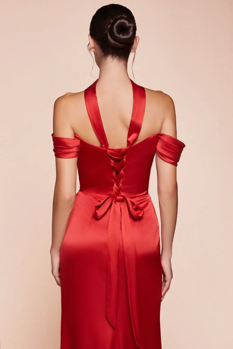The fitted Emerson Gown features a stunning sweetheart off-the-shoulder design with a gathered hipline and an elegant leg slit, crafted from luxe satin. The structured boned bodice provides excellent support, while the lace-up corset back can drape around the neck for a unique twist. Perfect for bridesmaids, wedding guests, or formal events, this dress combines sophistication and allure effortlessly. Make a statement at your next occasion with this exquisite gown!