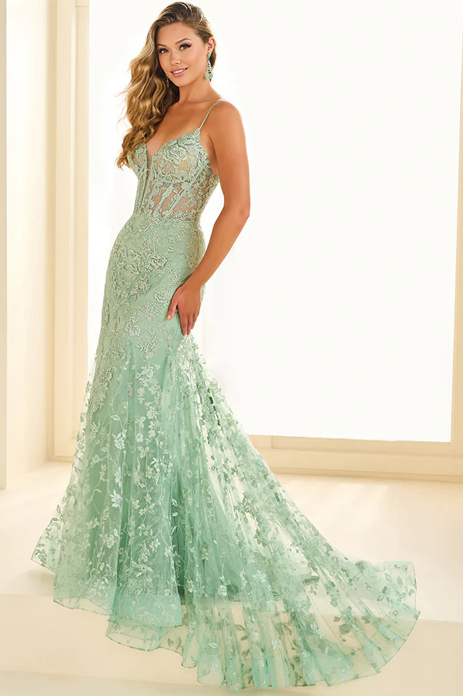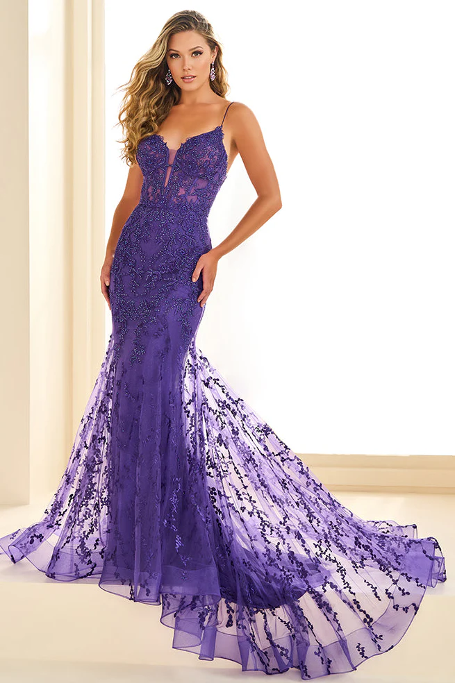 Step into the spotlight and captivate the room in the mesmerizing Ellie Wilde dress EW36008. This extraordinary long romantic gown is a true masterpiece, crafted from embroidered mesh and glitter tulle, adorned with exquisite stone accents that shimmer with every movement, ensuring you're the center of attention. The dress features a timeless sweetheart neckline that beautifully frames the décolletage, while the corset bodice with a lace-up back adds a touch of allure and ensures a perfect fit. The fit-and-flare silhouette gracefully flatters your figure, and the natural waistline enhances your curves, creating a breathtaking look for unforgettable moments.