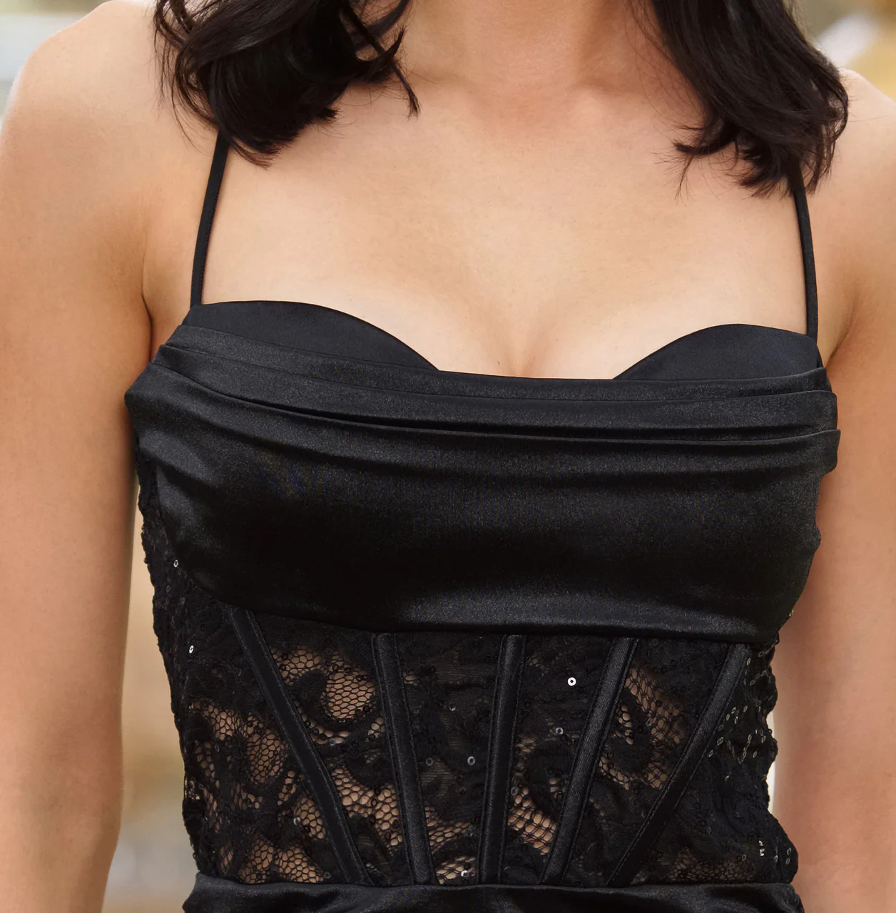 Take your style up a notch with this ruched satin mini dress! You'll be sure to turn heads in this little number with its sweetheart neckline, pretty sequin lace corset detailing, and mini-length, curve-hugging silhouette. Pair with some heels and statement earrings for a gorgeous night out look.